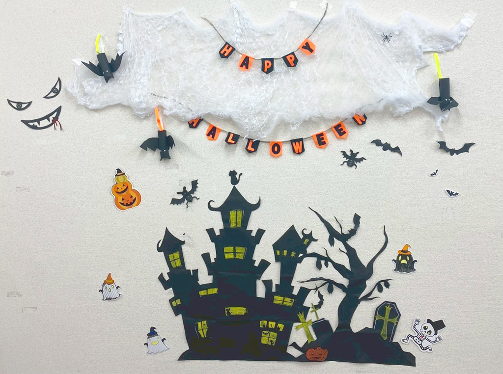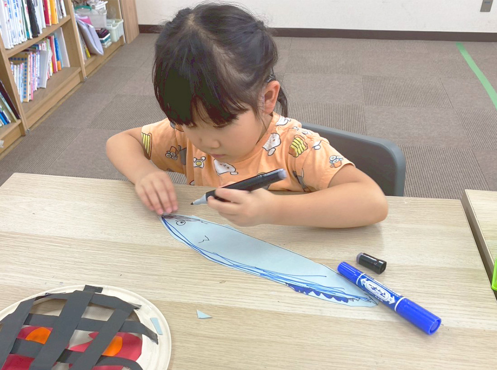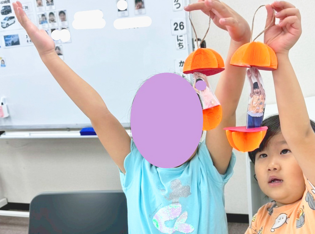 まずは幼稚部の子どもたちの活動をご紹介します。幼稚部の子どもたちは、秋にちなんだ工作を楽しみました☆旬のサンマやブドウといった秋の味覚や、ハロウィンに向けてジャック・オ・ランタンを作りしました♪