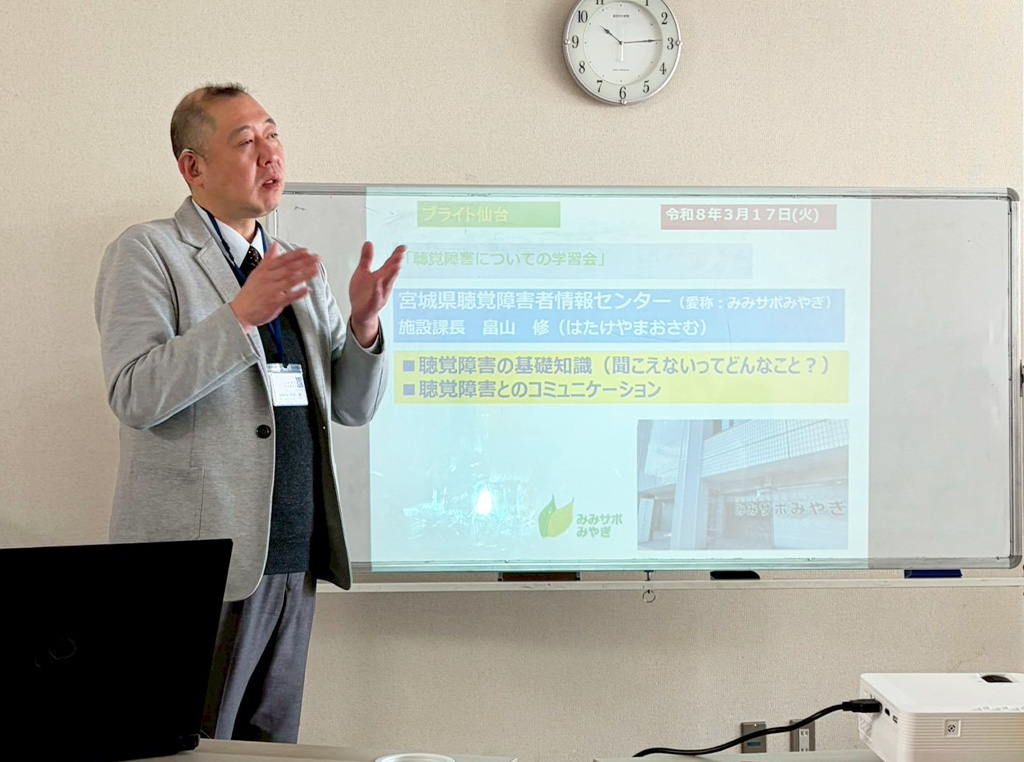 仙台市太白区長町にあるブライト仙台では、卒業式を終えたお子様や、春休みを迎えた子どもたちが、今日も元気に活動しています。3月17日(火)には、みみサポみやぎ施設課長の畠山 修(はたけやま おさむ)さんをお迎えし、障がい理解啓発の講話会を開催しました。